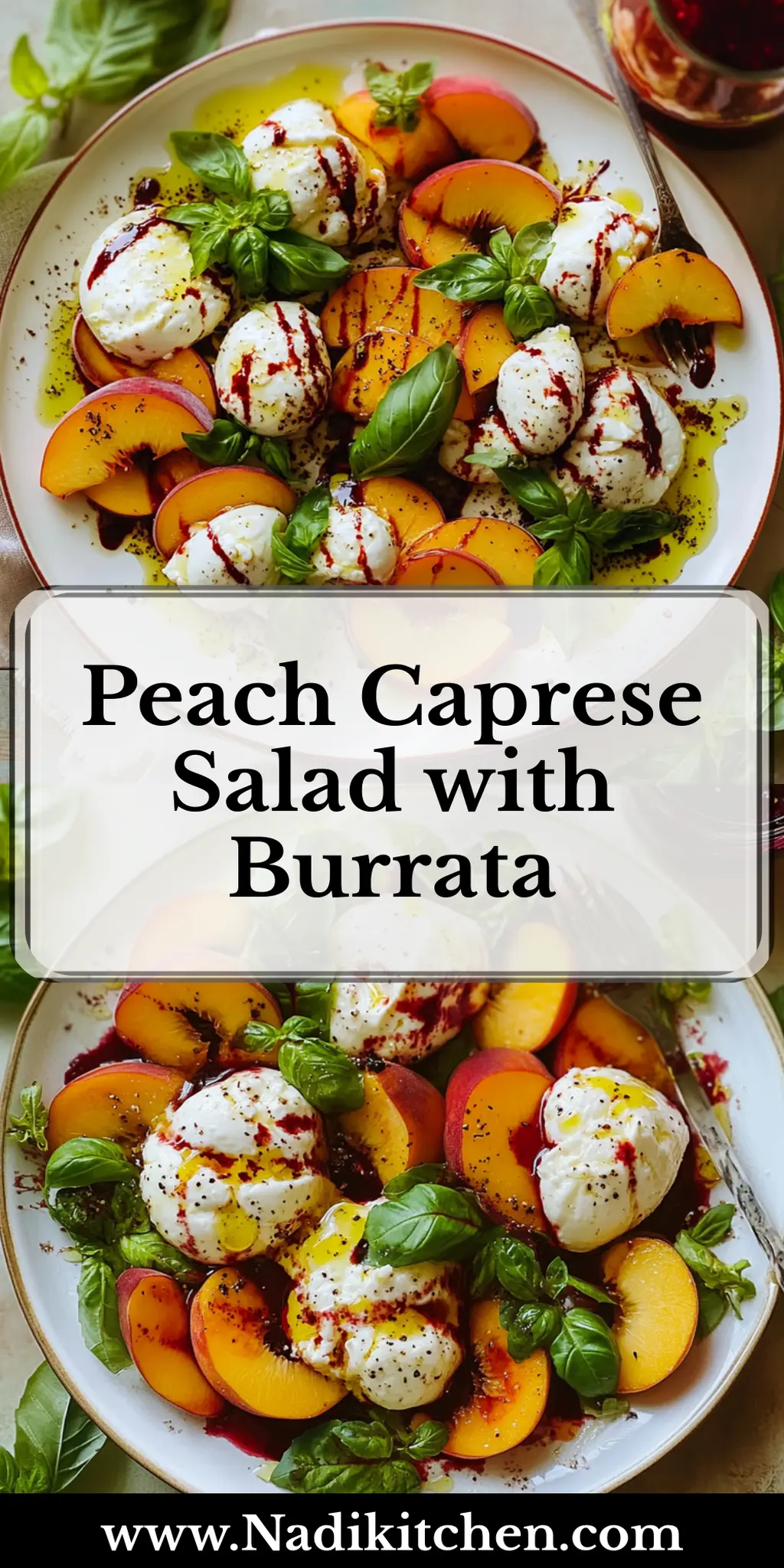 A refreshing Peach Caprese Salad with Burrata that combines juicy peaches, creamy burrata, and vibrant cherry tomatoes for a delightful summer dish.