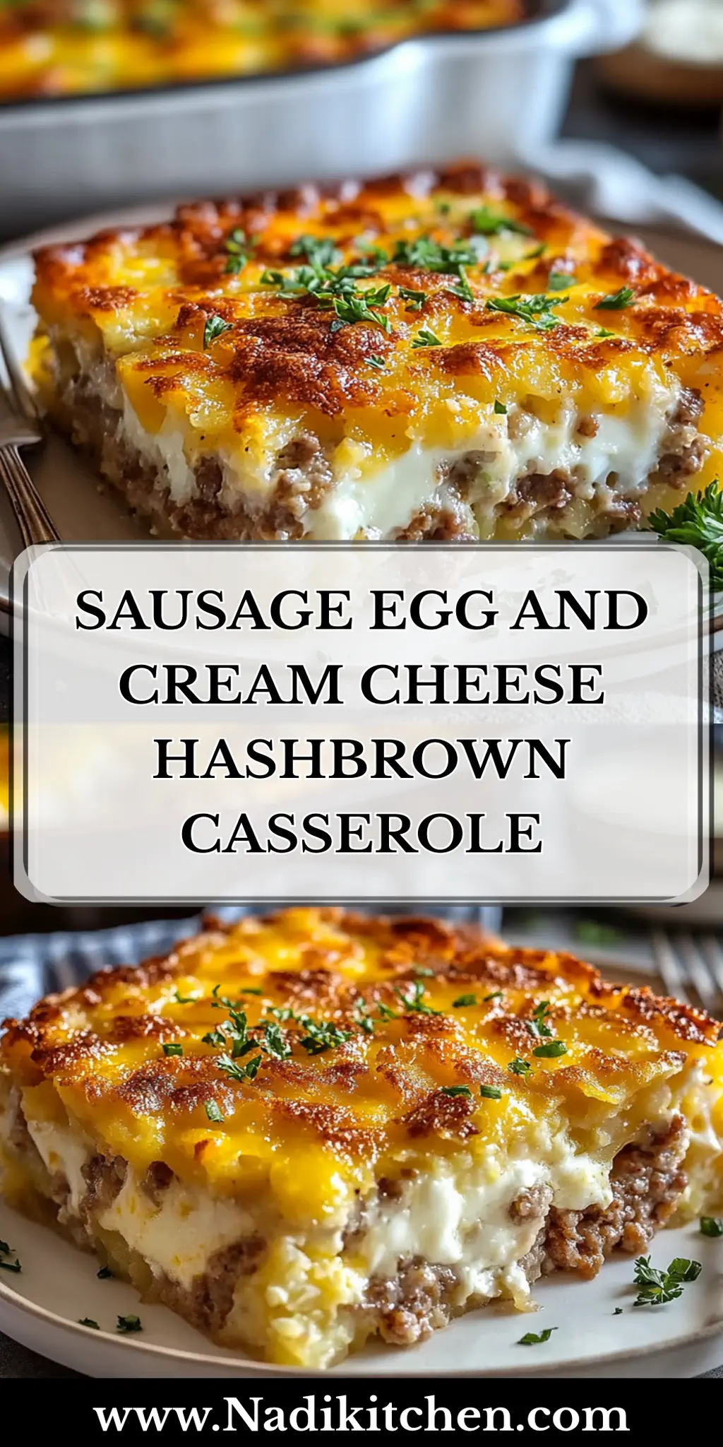 A delightful Sausage Egg and Cream Cheese Hashbrown Casserole filled with savory sausage, creamy cheese, and crispy hashbrowns, perfect for any meal.